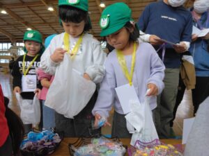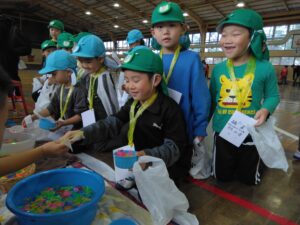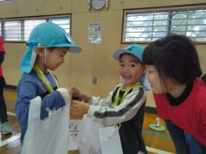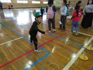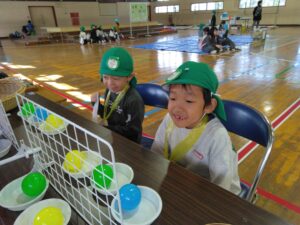 体育館に入ると、小学生のお兄さんお姉さんが「いらっしゃい!いらっしゃい!」とたくさん声を掛けてくれて、少し照れていた子どもたち😊