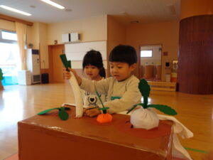 葉っぱを見て、これはなんの野菜かな?とクイズをすると、わかる子もたくさんいてびっくりしました😆