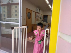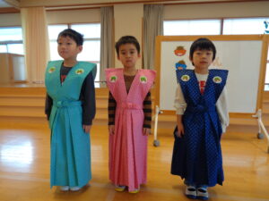 小さいお友だちのお部屋で豆まきをしてくれたのは、裃を着た3人のお友だち✨