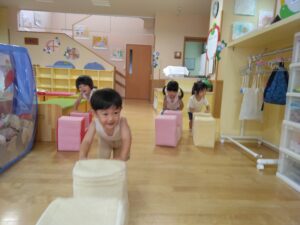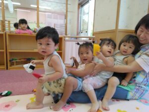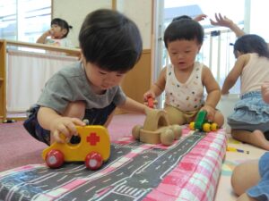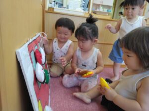 ひよこ組1歳児のお友だちも、一人でじっくり遊ぶだけでなく、お友だちと一緒に同じ遊びを