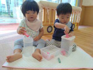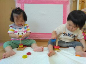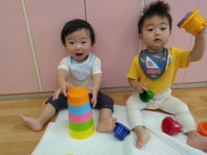 カップの積み重ねも、保育士と一緒に
